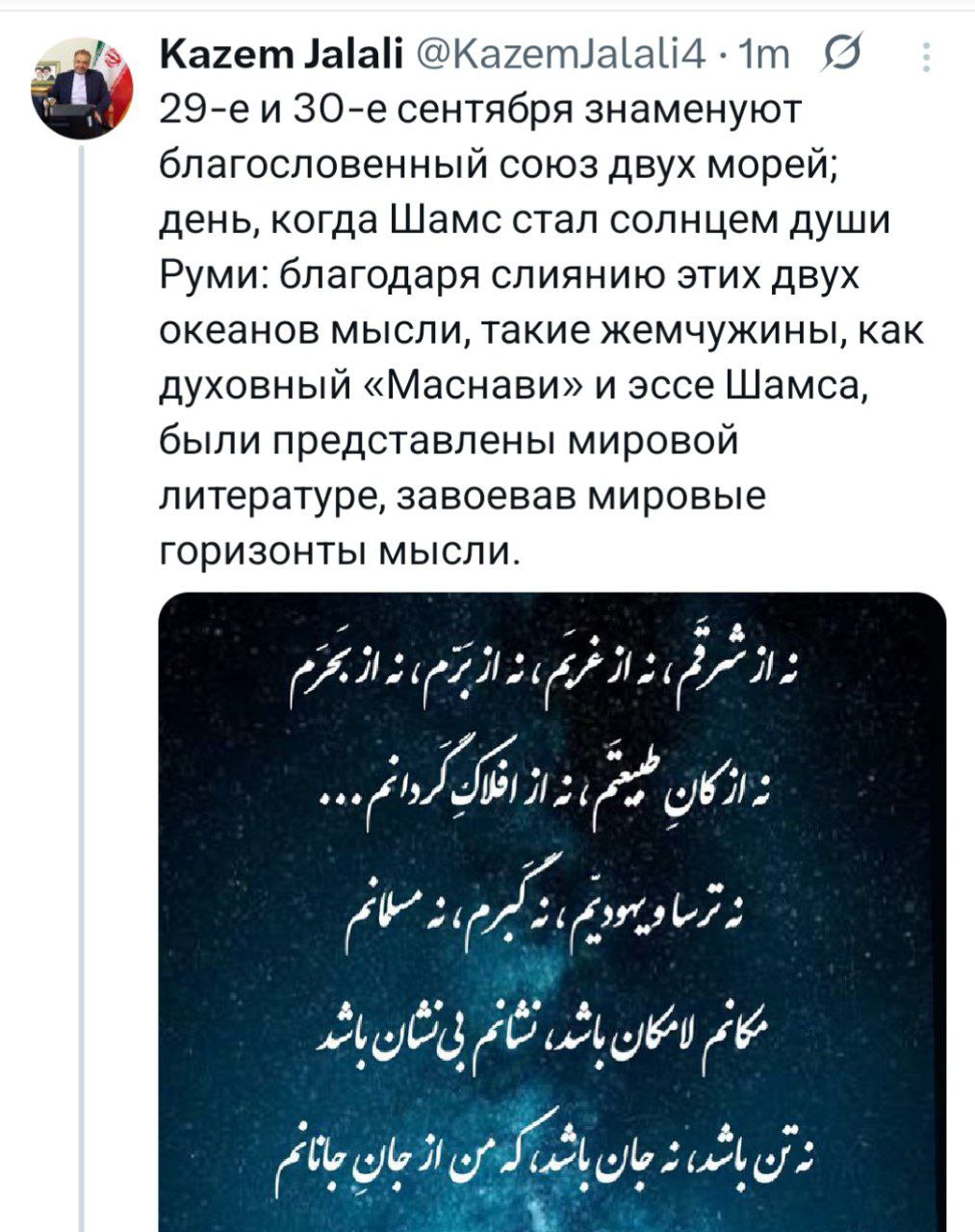 Да будет почитаема память Шамса Тебризи (29 сентября) и Руми Джалалуддина Балхи (30 сентября).