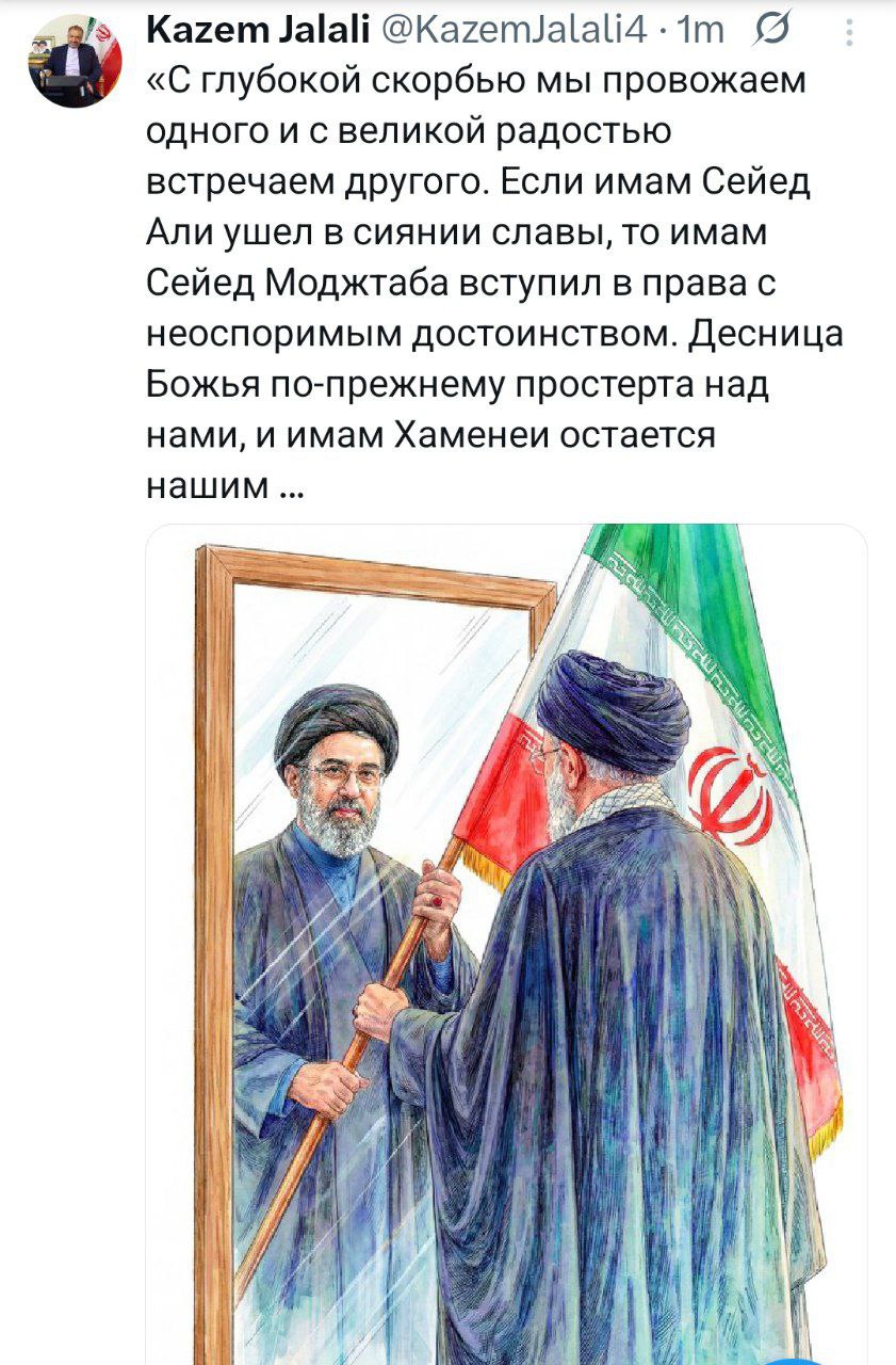 «С глубокой скорбью мы провожаем одного и с великой радостью встречаем другого. Если имам Сейед Али ушел в сиянии славы то имам Сейед Моджтаба вступил в права с неоспоримым достоинством. Десница Божья по-прежнему простерта над нами и имам Хаменеи остается нашим непоколебимым лидером. Выражая признательность Совету экспертов за их стойкость и мудрый выбор я поздравляю доблестный народ Ирана и всех последователей мученика Хаменеи по всему миру. Мы подтверждаем свою священную верность и нерушимую присягу Верховному лидеру».